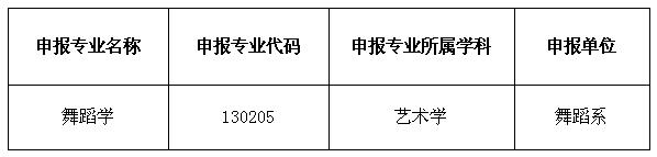 根据《关于做好2016年度普通高校本科专业申报工作的通知》(陕教高办〔2016〕25号)文件要求,经相关院系申请,校学术委员会审议通过,决定拟申请本科专业“舞蹈学”,现将拟申报专业信息予以公示,如有异议,请向教务处反映。
