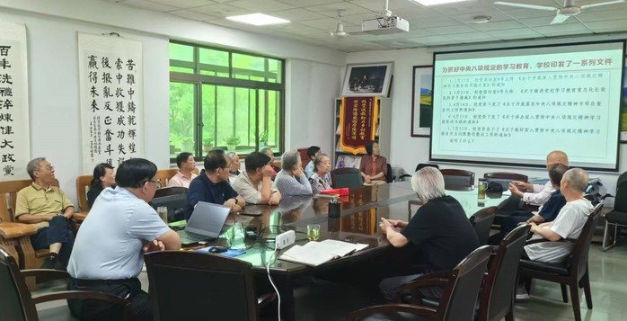 为认真落实校党委《关于开展深入贯彻中央八项规定精神学习教育的实施方案》,推进党纪学习教育常态化长效化,抓好离退休党员思想政治建设,开展好自查自纠和整改整治工作,5月26日上午,离退休党总支在教工活动中心二楼会议室,召开深入贯彻中央八项规定精神学习教育专题会。