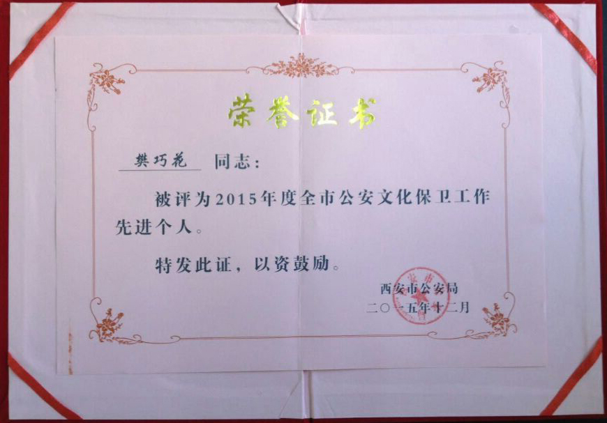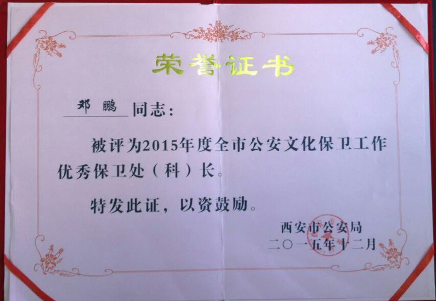 2015年1月14日上午,西安市公安局召开了文化保卫系统工作会议暨表彰2015年度文化保卫系统先进集体和先进个人,我院保卫处副处长邓鹏同志荣获优秀保卫处长称号,樊巧花同志荣获先进个人称号。