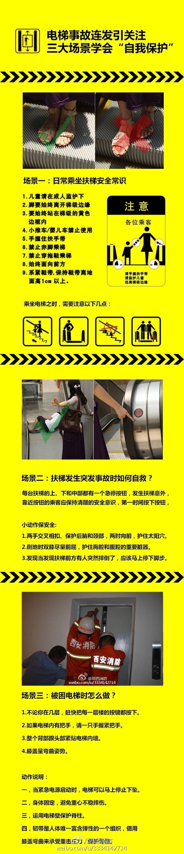 电梯几乎出现在每天生活中,但是近期电梯事故频频发生让人心惊。乘坐扶梯有哪些安全常识?扶梯发生突发事故时如何自救?被困电梯时怎么做?点大图,学会自我保护!