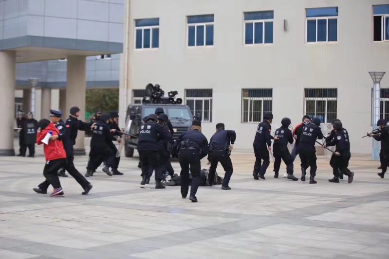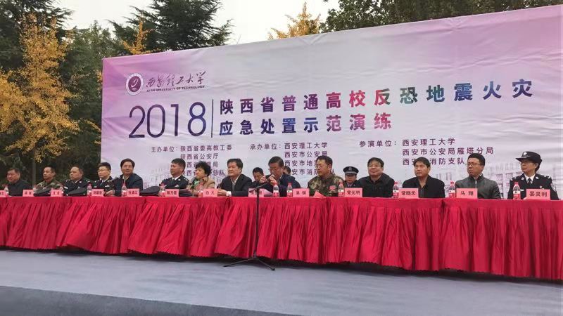 2018年11月4日上午,在西安理工大学曲江校区举行了“2018陕西省普通高校反恐地震火灾应急处置示范演练”,省委高教工委副书记陈乃霞、省公安厅副厅长杜清江、省应急办主任白凡等领导出席。来自全省82所高校的主管领导、保卫处长及保卫干部200余名观摩此次演练。我校保卫处长邓鹏代表我校参加。