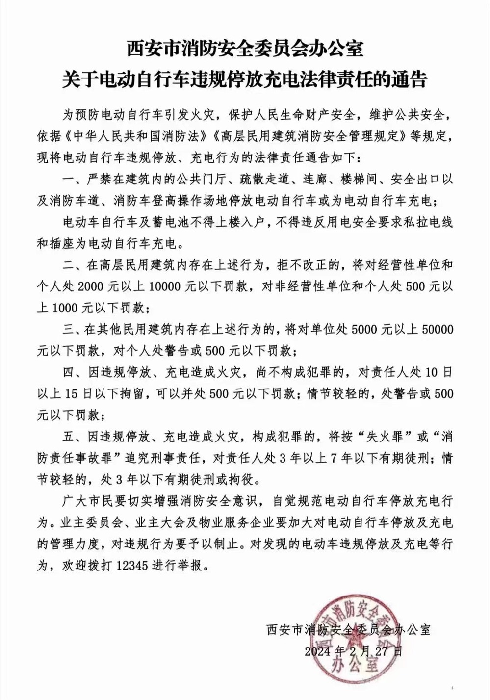 西安市消防安全委员会办公室关于电动自行车违规停放充电法律责任的通告