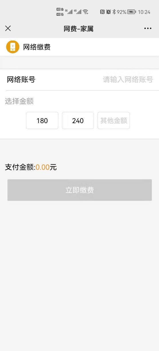 扫码后填写网络账号,显示用户姓名,输入金额,确认后进行缴费。