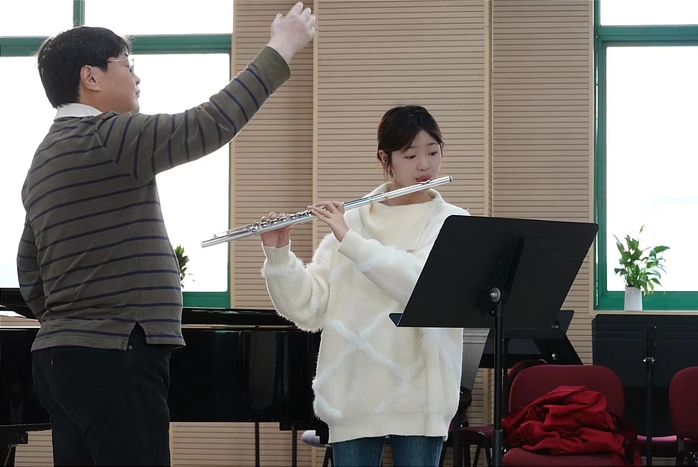 韩国良教授为长笛专业学生一一授课。授课过程中,韩老师耐心指导、鼓励、肯定了每一名同学的优点,同时对大家需要改进的地方进行了有针对性的训练。