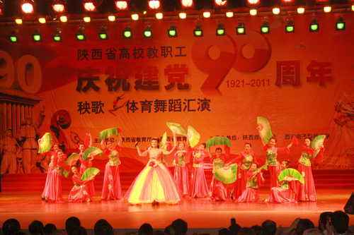 为隆重庆祝中国共产党成立90周年,全面展示陕西高校教职员工奋发进取、昂扬向上的精神风貌,激发和凝聚广大教职工爱党爱国爱校热情,团结和号召广大教职员工坚定信念、振奋精神、鼓足干劲,投身党的教育事业,6月13日、14日,由陕西省教育厅、省教育工会举办的“陕西省高校教职工庆祝建党90周年秧歌、体育舞蹈汇演”在西安电子科技大学隆重举行。我院党委副书记 、常务副院长孙卫国,副院长、工会主席安金玉亲临演出现场为教职工鼓劲、加油,并和其他高校领导一起观看了演出。最终,由我院工会组织选送的自编歌舞秧歌《米脂婆姨》获最高奖项“优秀展演奖”,院工会获“优秀组织奖”。