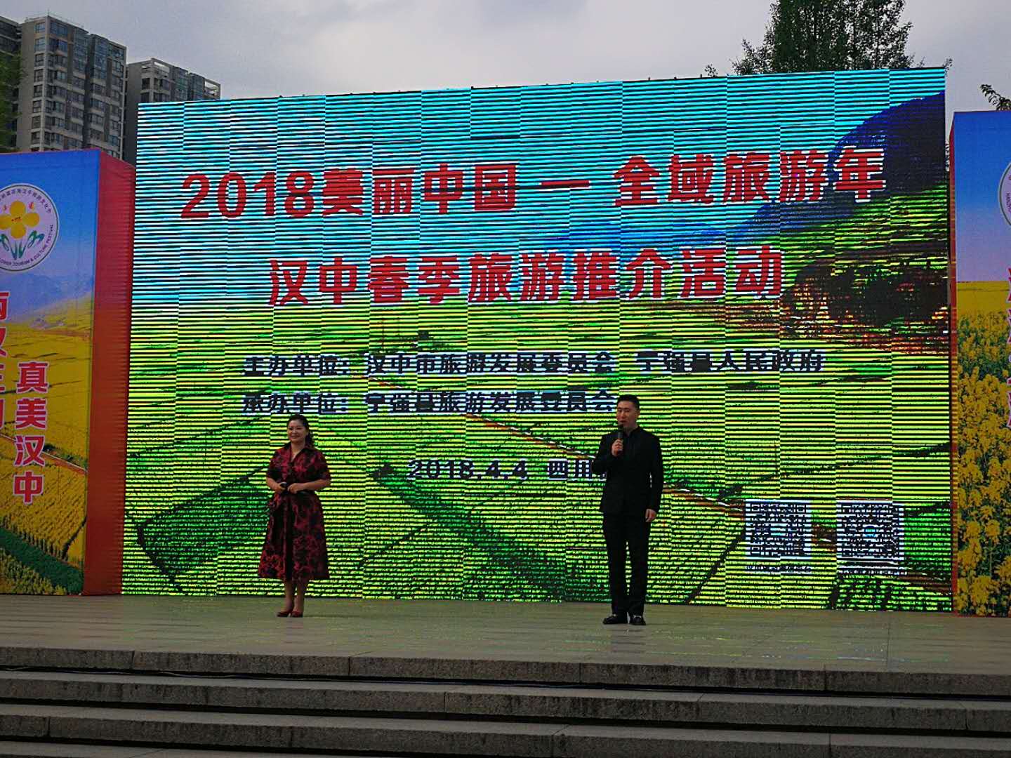 4月4日下午,由汉中市旅游发展委员会、宁强县人民政府主办,宁强县旅游发展委员会承办的2018中国最美油菜花海汉中旅游文化节暨汉中春季旅游宣传推介活动在四川省德阳市文庙广场举行。德阳市旅游局,汉中市旅发委,宁强县委、县政府领导,四川新闻网、成都商报、德阳电视台等8家新闻媒体,德阳市环宇国际旅行社、德阳九州国际旅行社等20余家旅行社、涉旅企业、各界群众等1000余人参加了本次推介活动。应我院精准扶贫帮扶县——汉中市宁强县旅发委助力演出的邀请,西安音乐学院领导高度重视,在工会的组织下,选派了以团委李强书记和国家一级演员喻红等重量级的歌唱家,由我院驻村扶贫干部高学飞带队参加了此次推介会演出活动。