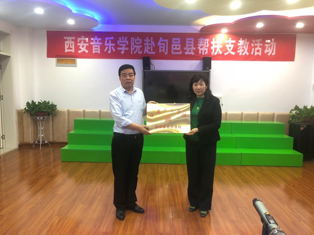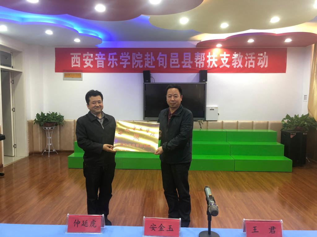 特色产业帮扶活动在旬邑县实验小学进行。一首旋律优美、高亢激昂的唢呐合奏曲《全家福》拉开了帮扶活动的序目,安金玉代表学校向旬邑县职教中心授牌“西安音乐学院特色产业帮扶基地”,仲廷虎向县实验小学授牌“西安音乐学院星愿基地示范校”,并捐赠双排键2台。