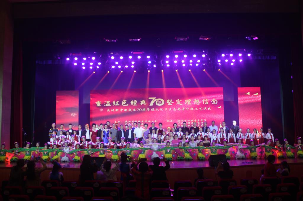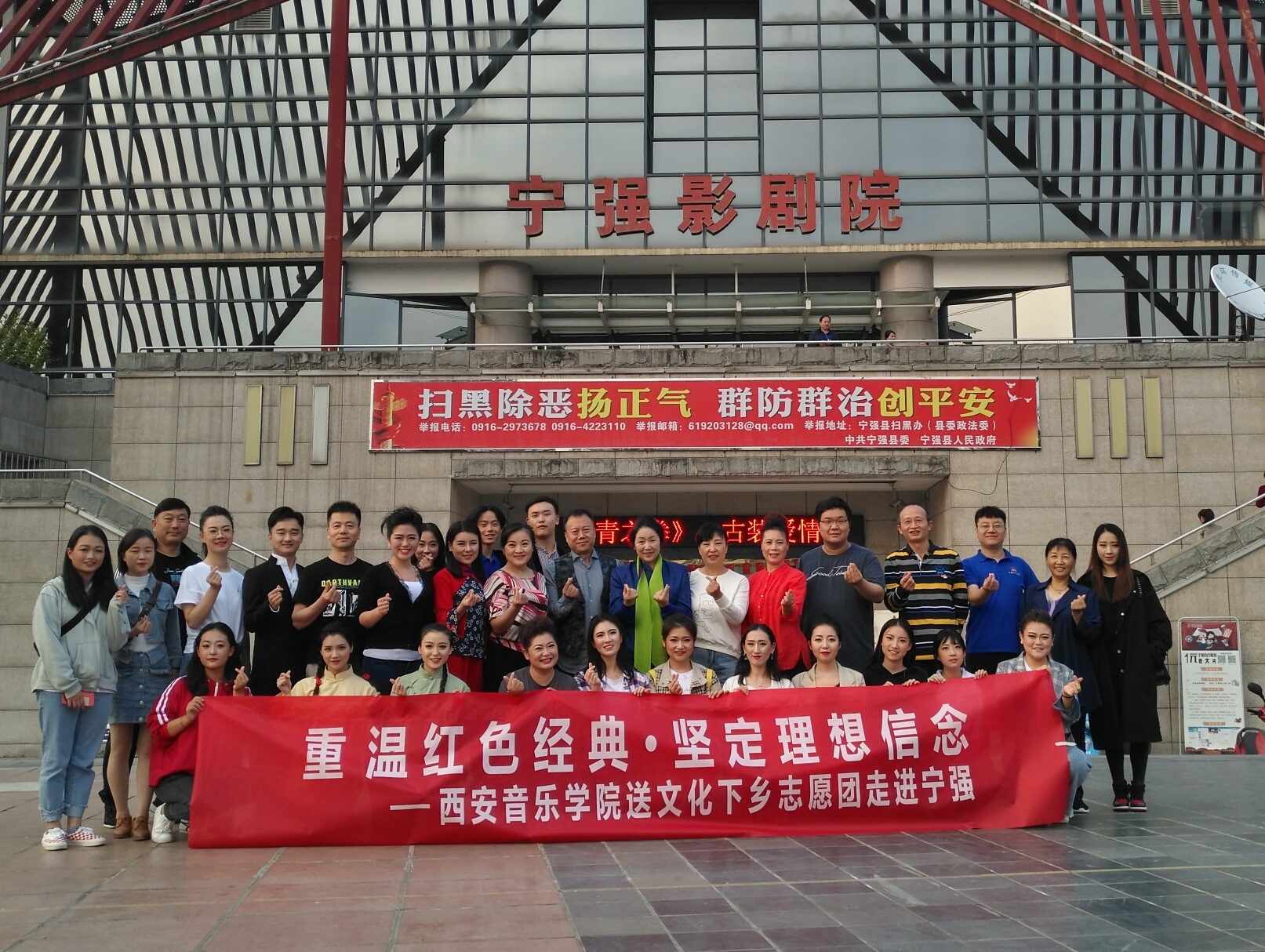 为宣传贯彻党的十九大精神,庆祝新中国成立70周年,助力脱贫攻坚,2019年9月29日晚7时,由陕西省教科文卫体工会、宁强县委县政府主办的“重温红色经典·坚定理想信念”送文化下乡文艺晚会在汉中市宁强县影剧院隆重举行。陕西省教科文卫体工会主席陈建树、西安音乐学院副院长安金玉、宁强县县委书记陈建斌及宁强县机关事业单位干部职工和当地群众1000余人观看了演出。