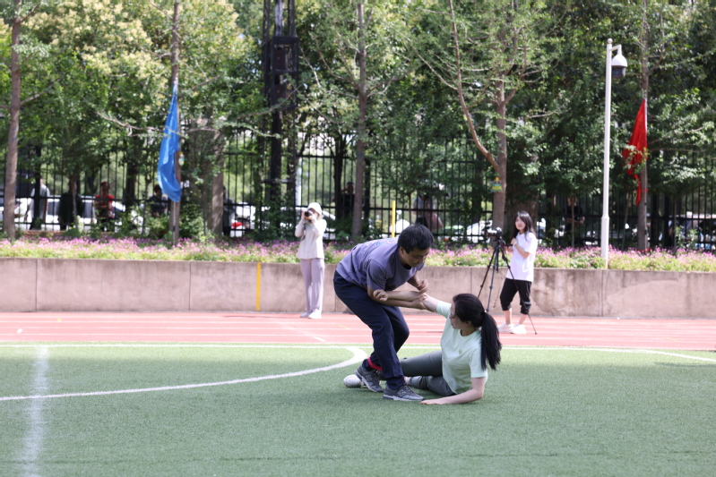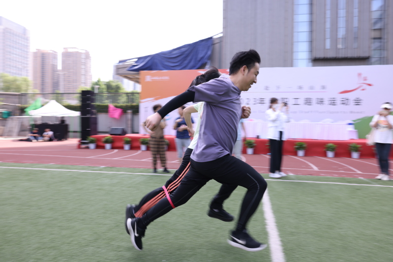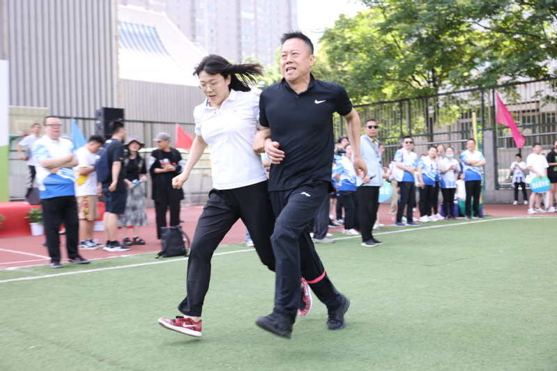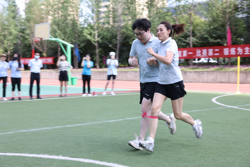 在进行“5×30米往返绑腿接力”项目,大家互相鼓励默契配合,摔倒了立刻爬起来继续前行,这种不畏强手、奋勇争先、重在参与的氛围感染着运动场上的每一个人。