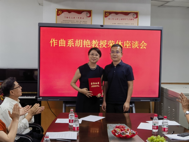 会上,梁成山为胡艳教授颁发荣休证书。他指出,胡艳教授把最好的青春年华奉献给了教育事业,甘当人梯、薪火相传,为我校视唱练耳教学事业作出了重要的贡献。