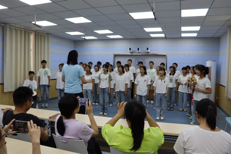 接下来的几天,志愿者们分赴两路开始节目排练。在胡家坝镇初级中学,志愿者们依据当地学校实际乐器配置以及学生对音乐的学习情况排练《向云端》大合唱,并依据当地特色创作出朗诵诗词,同时加入乐器葫芦丝、非洲鼓、小件打击乐器等,进行学习和排练;在铁锁关镇初级中学,志愿者们则因地制宜,运用了腰鼓、锣鼓、钢片琴等大量的打击乐器和合唱进行《好汉歌》排练,让同学们在学习中体验了音乐的魅力。排练过程中,同学们用自己认真积极的态度表达着对音乐的热爱。