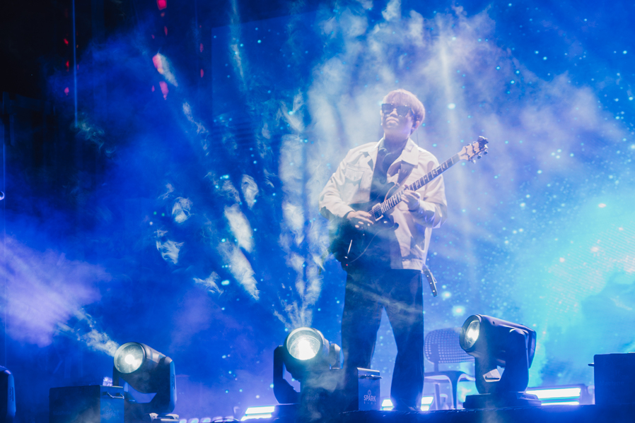现代音乐学院张洺川以电吉他独奏《星河》,电子音效与灵动指法交织,为观众描绘浩瀚宇宙的奇幻音景。