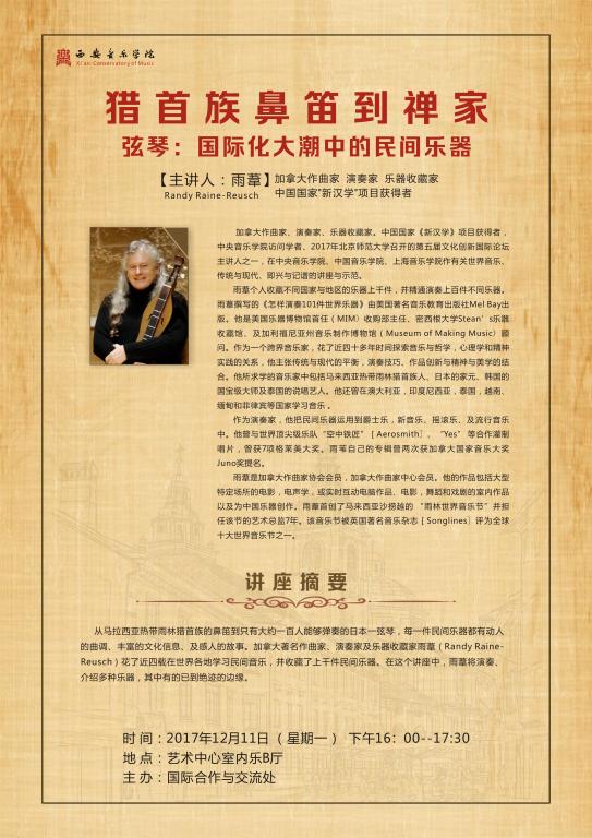 雨葦 (Randy Raine-Reusch)加拿大作曲家、演奏家、乐器收藏家。中国国家《新汉学》项目获得者,中央音乐学院访问学者、2017年北京师范大学召开的第五届文化创新国际论坛主讲人之一,在中央音乐学院、中国音乐学院、上海音乐学院作有关世界音乐、传统与现代、即兴与记谱的讲座与示范。