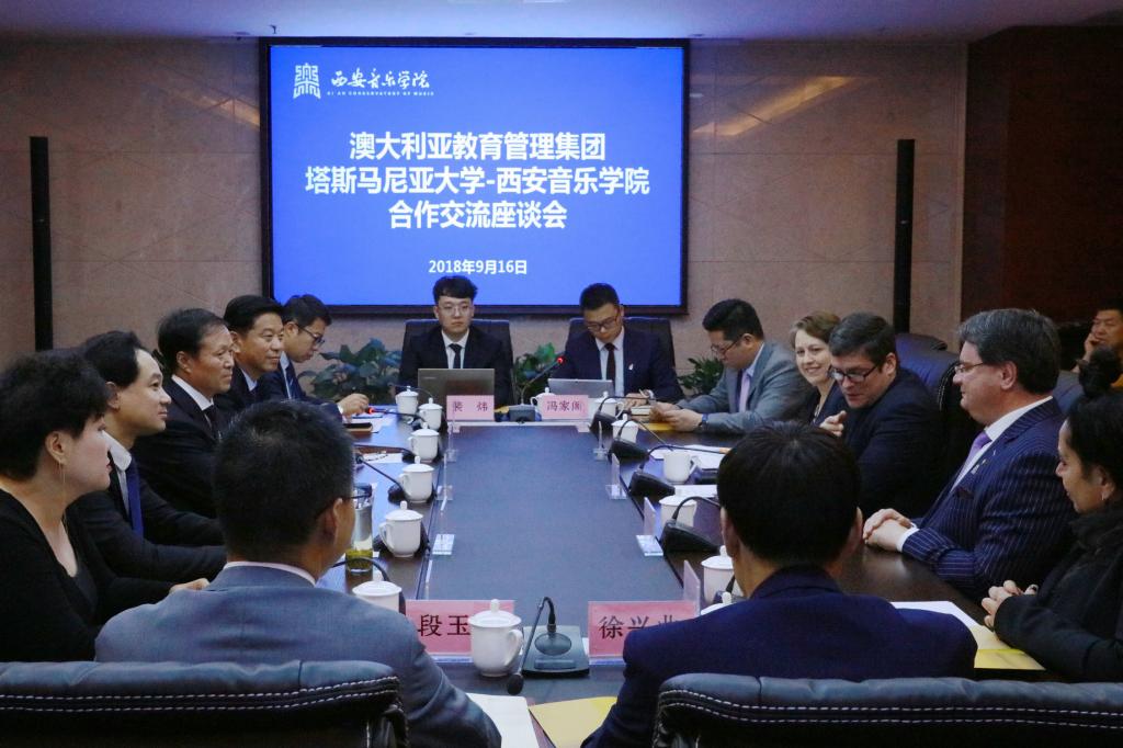 2018年9月16日下午,澳大利亚教育管理集团与澳大利亚塔斯马尼亚大学来访我校。l来访期间,双方代表进行了座谈交流,并参观了我校艺术中心。