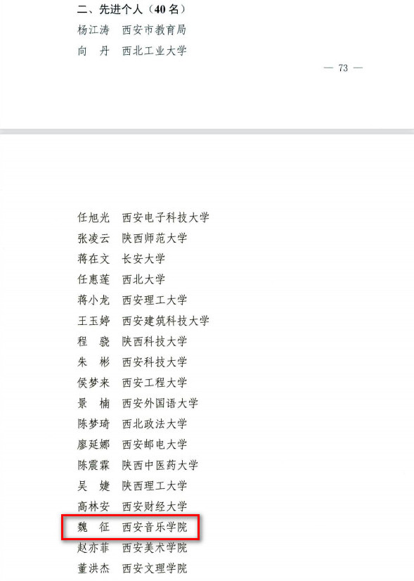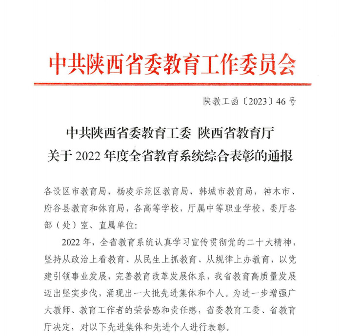 近日,中共陕西省委教育工委、陕西省教育厅印发《关于2022年度全省教育系统综合表彰的通报》(陕教工函〔2023〕46号),我校国际合作与交流处(港澳台事务办公室)处长魏征荣获2022年度陕西教育系统外事(港澳台)工作先进个人。
