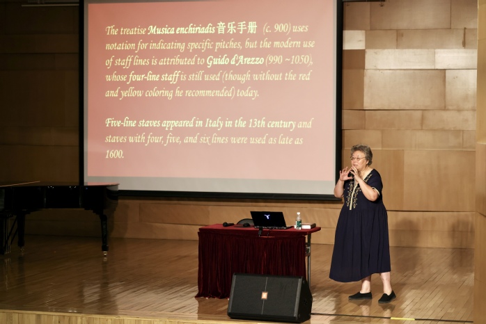 系列讲座从《西方音乐的起源与古希腊文明的关系以及音乐在西方美术中的象征意义》开始,系统介绍了西方音乐的起源、记谱与唱名发的发展、节奏的起源与发展、乐谱制作技术的发展与巴赫的音乐人生等内容。油雅莉教授的讲座形象生动并重视实践,同学们获得了大量系统知识外还掌握了阅读并演唱四线谱等技能。
