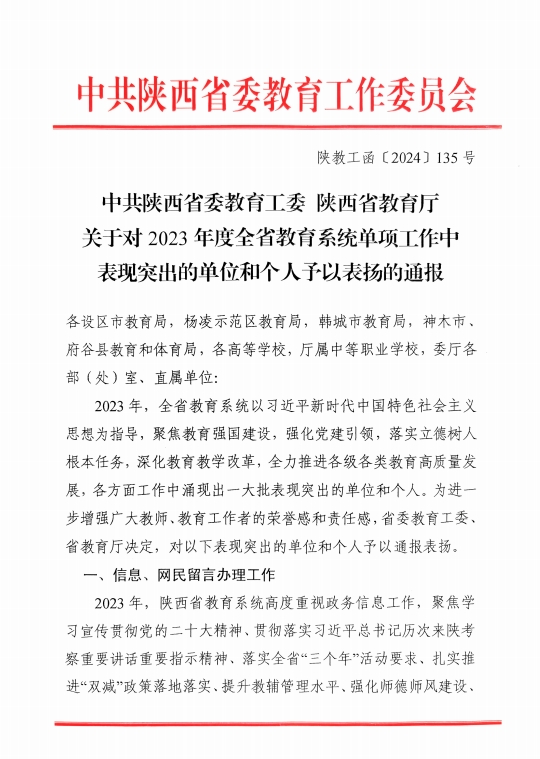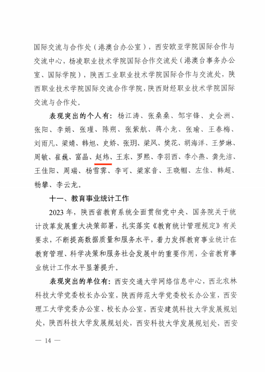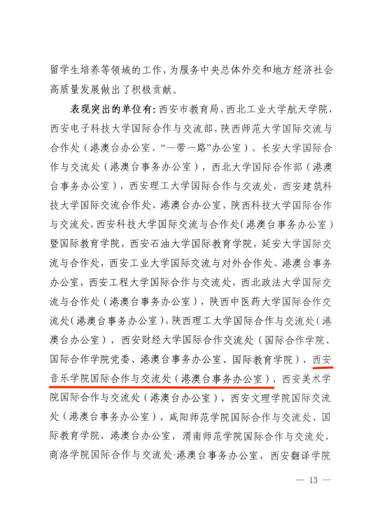 近日,陕西省教育工委、陕西省教育厅公布了《关于对2023年度全省教育系统单项工作中表现突出的单位和个人予以表扬的通报》,我校国际合作与交流处(港澳台事务办公室)获评外事(港澳台)工作“表现突出单位”,国际事务科副科长赵炜荣获2023年度外事(港澳台)工作先进个人。