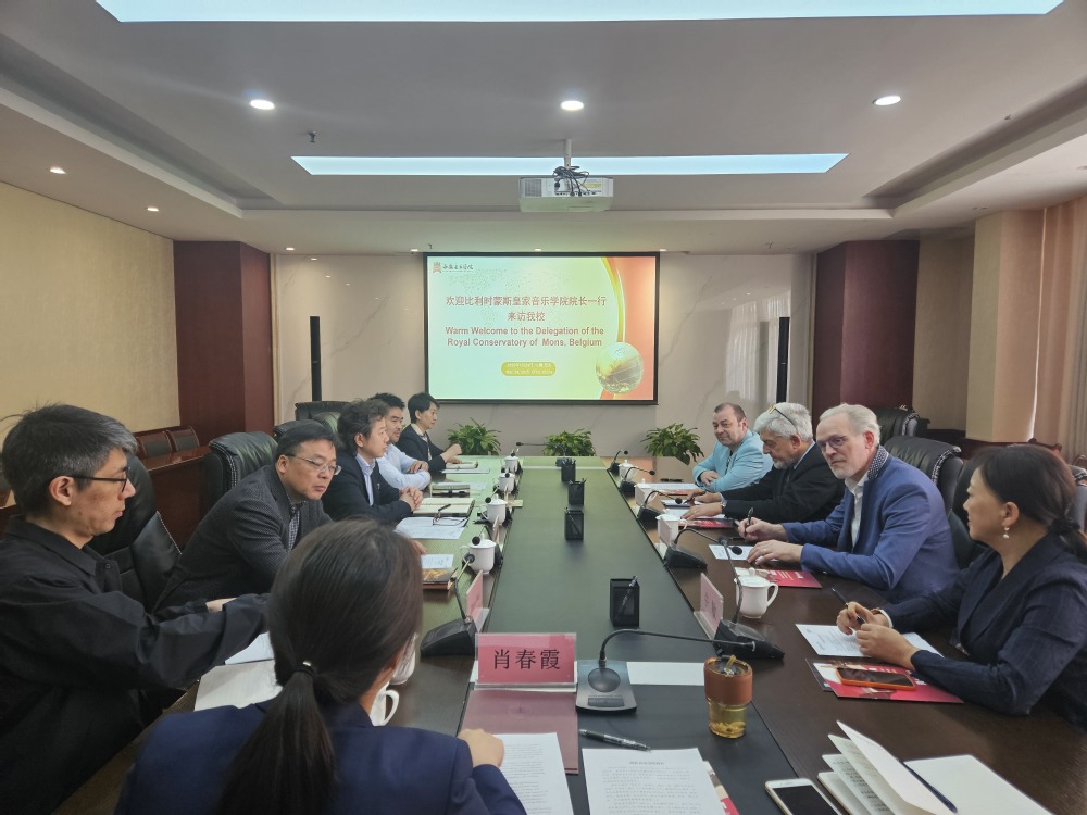米歇尔·斯托克姆教授感谢我校的热情接待,并高度评价了我校在传统音乐传承与创新、现代音乐教育体系构建方面取得的成就。他表示,蒙斯皇家音乐学院作为比利时法语区的音乐学府,与西安音乐学院在推动音乐文化多样性、融合传统与现代艺术理念方面有着高度共识。希望两校通过师生互访、联合演出、学术资源共享等形式,搭建中比音乐文化交流的桥梁,为青年音乐家创造更多实践平台。双方还就作曲专业设置、管弦系培养体系等展开交流探讨。