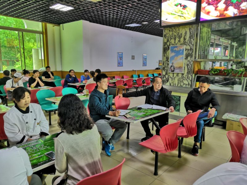 5月14日下午,后勤处处长邓鹏深入食堂,调研饮食工作,伙食科及经营摊位所有人员参加调研。