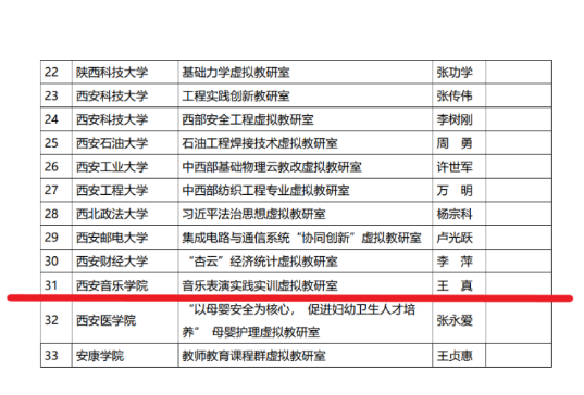 近日,陕西省教育厅发布了《关于公布陕西省虚拟教研室试点建设项目立项结果的通知》(陕教高办〔2021〕23 号),西安音乐学院王真教授领衔申报的“音乐表演实践实训教研室”成功获批立项,成为陕西省首批37个虚拟教研室建设项目之一。