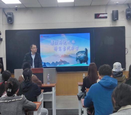 11月20日,院长王刚为学生讲授《赓续历史文脉,谱写当代华章》专题。王刚从历史悠久缔造中华文化、培根铸魂推动文化繁荣、笃定前行建设现代文明三个方面,通过深入浅出的讲解,让同学们了解到中华文明五个突出特性的内涵和相互联系、中华文化繁荣兴盛与中华民族伟大复兴的关系,充分认识中华文化的博大精深,增添了同学们对中华历史文化的自信心与自豪感。