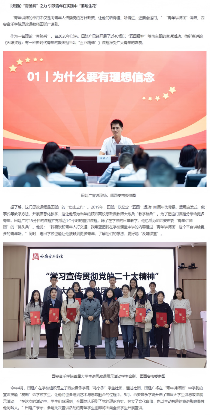 马克思主义学院教师田廷广作为团西安市委“青年讲师团”成员,其宣讲事迹于2023年12月16日受到中国青年报深度报道。