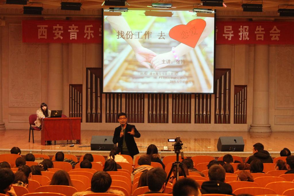 本次报告会是FM101.1陕西首档广播职场就业节目《张持有道》高校大学生就业指导巡回演讲第二十五站,由西安音乐学院学工部就业指导中心主任周冰主持。演讲特邀陕西首档广播职场就业节目《张持有道》主持人张持,为我院同学们作了一场题为《找份工作去恋爱》的精彩讲座。讲座中,张持老师围绕大学生毕业找工作与恋爱之间的关系,诙谐幽默地引导同学们用恋爱的流程应对求职的流程,用恋爱的法则诠释工作的法则,并通过轻松的方式指导同学们定位自我和职业、获取招聘信息、掌握面试技巧、调整就业心态,打破了以往大学生职业生涯规划课程生硬的授课模式。现场互动踊跃,活动深受大学生的热捧和喜爱。此次报告会使同学们更进一步地认识到了职业生涯规划的重要性,对其树立正确的就业观有良好的教育效果,在求职方面也给予了同学们极大的启发,使同学们进一步明确了自己的就业方向。各系参会书记辅导员班主任表示受益匪浅,希望以后能多举办类似就业指导报告会。