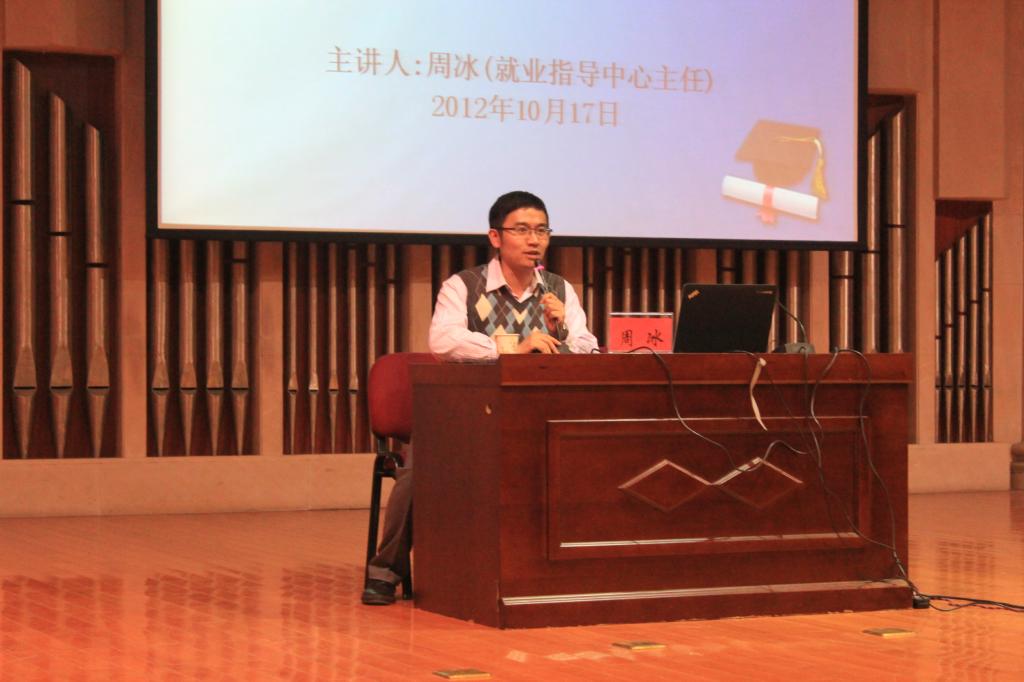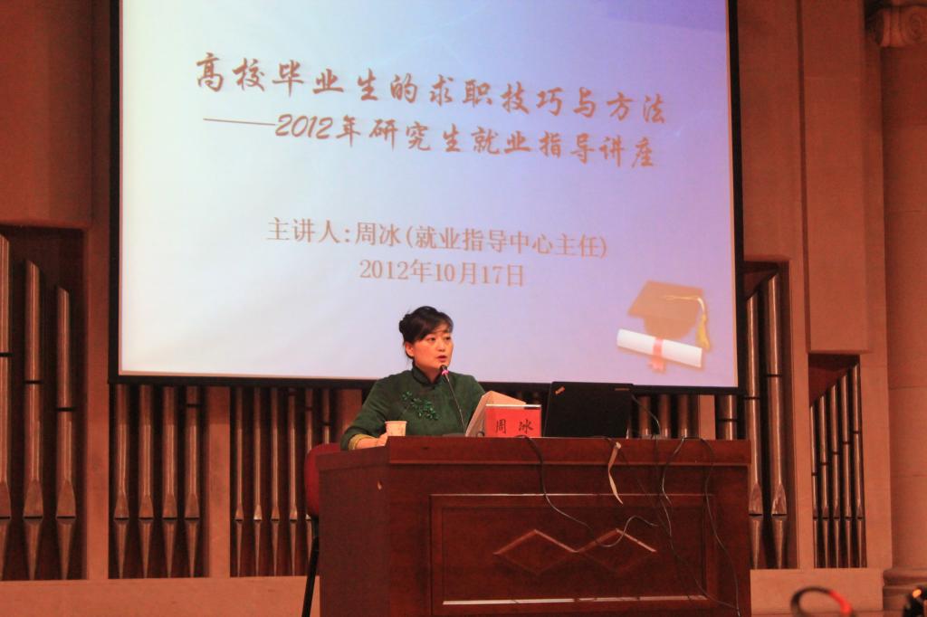 2012年10月17日下午2点20分,我院学工部就业指导中心主任周冰应我院研究生部发出的诚挚邀请,在学术厅为我院全体研究生做了题为《高校毕业生的求职技巧与方法——2012年研究生就业指导讲座》。