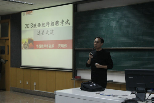 2012年11月5日晚上6时30分,我省2013年教师招聘考试专题讲座在我院5号楼717教室举办。讲座由学工部就业指导中心主办,主讲人为陕西华图教师事业部的贾瑞伟老师,针对对象为我院大三、大四学生。