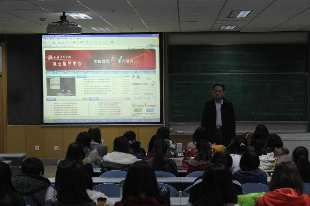 2012年11月12日,就业指导中心王权老师于5号教学楼617室为13届音教系的同学们举行了连续三场的《毕业生就业指导讲座》。