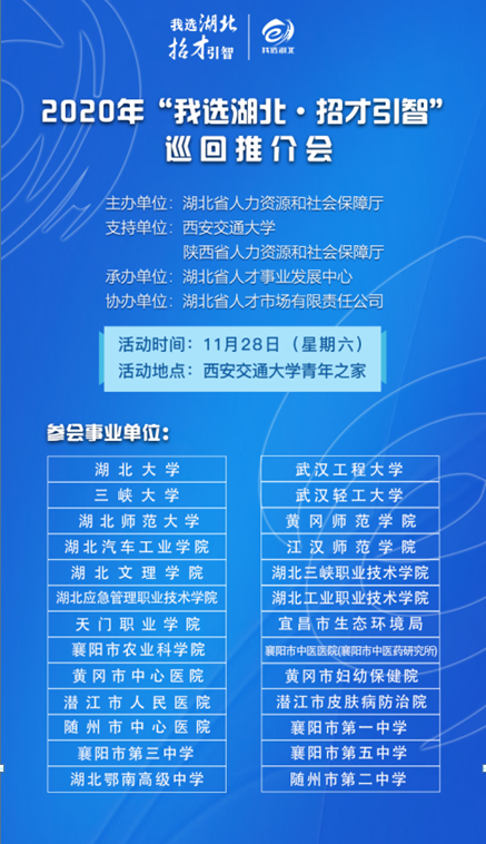 为促进我省经济社会高质量发展,进一步深入推进我选湖北计划,定于1128日赴陕西西安举办2020“我选湖北·招才引智”外省高校巡回推介活动,开展政策宣讲推介、毕业生招聘洽谈等活动。本次活动由湖北省人力资源和社会保障厅主办,西安交通大学、陕西省人力资源和社会保障厅提供支持,湖北省人才事业发展中心承办,湖北省人才市场有限责任公司协办。