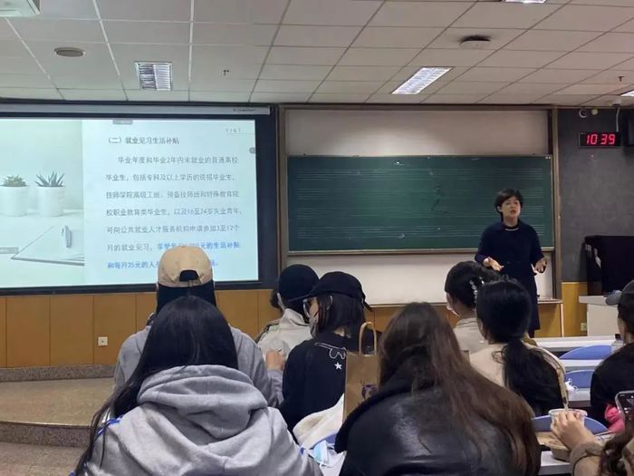 吴思雨与王雯为同学们讲解了近年来我校毕业生去向情况与相关就业政策。通过毕业生相关政策的解读以及对近三年毕业生就业数据的分析,使同学们对当前毕业生就业形势与就业情况有了宏观把握,对事业编制、考公考编、应征入伍、西部计划、三支一扶特岗教师等就业方向和基层就业政策与项目有了更全面深入的了解。同时,介绍了就业岗位的信息渠道“秦云就业小程序”,方便同学们获取较准确的就业信息。