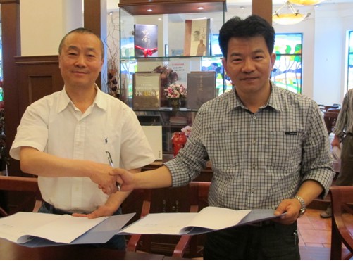 (韩兰魁副院长与费维耀社长在合作出版协议上签字)