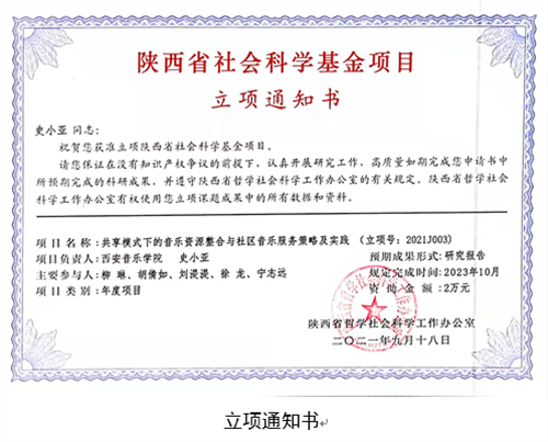 近日,陕西省哲学社会科学工作办公室公布了2021年陕西省社会科学基金年度项目立项名单,我校教务处副处长、副教授史小亚老师成功获批该项目,项目名称为《共享模式下的音乐资源整合与社区音乐服务策略及实践》(2021J003)。