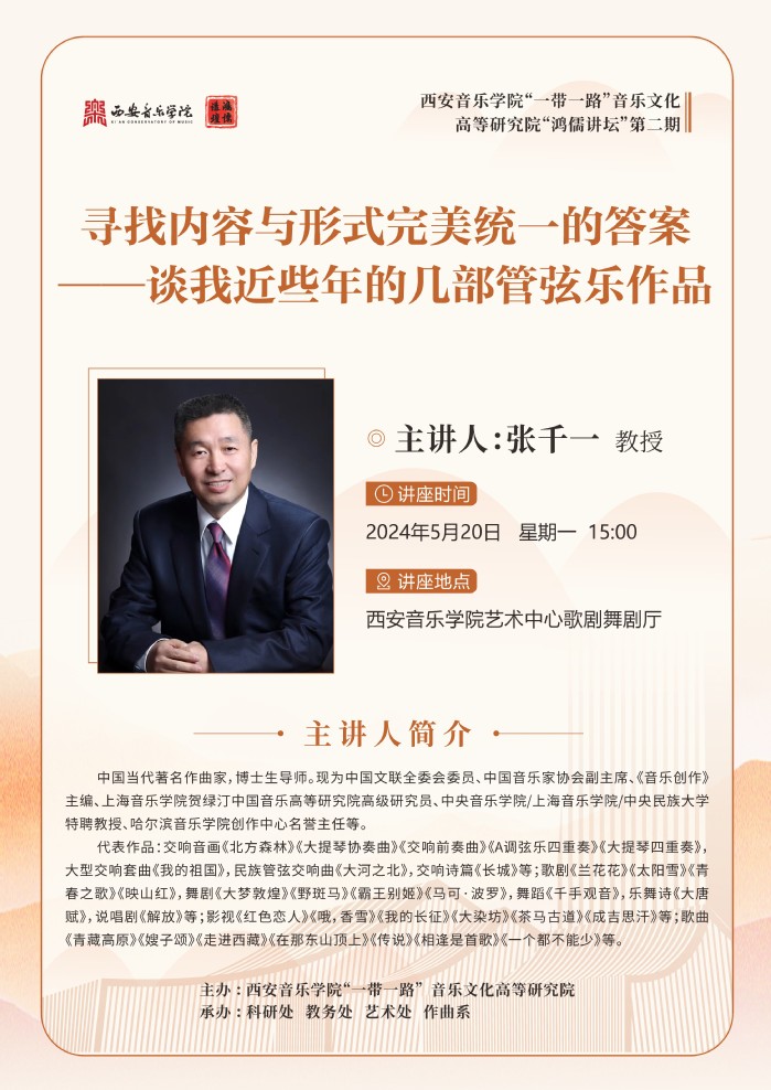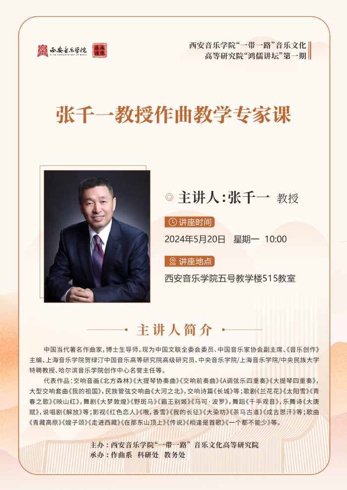 2024年5月20日,中国当代著名作曲家、原总政歌舞团团长、中宣部首批“四个一批”人才、中国音乐家协会副主席张千一教授受邀作为西安音乐学院“鸿儒讲坛”首期开讲专家,为全校师生带来两场精彩的专家教学及学术讲座。活动由“一带一路”音乐文化高等研究院主办,科研处、作曲系、艺术处、教务处、信息化处联合承办。校党委书记张立杰、院长王刚出席本次活动,相关院系负责人及师生参加。