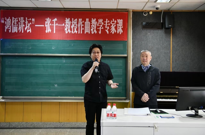 20日上午,“鸿儒讲坛”第一期《张千一讲授作曲教学专家课》在五号楼515教室举办。