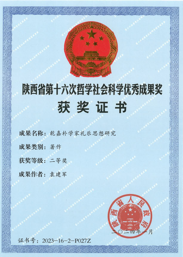 近日,从省社科联官方获悉,我校教师袁建军撰写的著作《乾嘉朴学家礼乐思想研究》获得“陕西省第十六次哲学社会科学优秀成果奖”著作类二等奖。