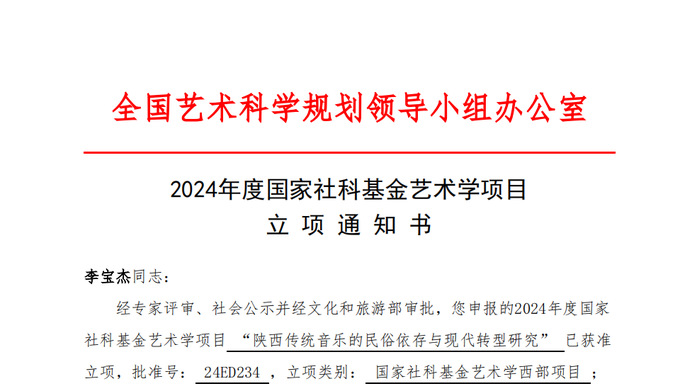 近日,文化和旅游部科技教育司、全国艺术科学规划领导小组办公室正式公布了2024年度国家社科基金艺术学项目立项名单,我校李宝杰教授及其团队申报的《陕西传统音乐的民俗依存与现代转型研究》获批西部项目(立项号:24ED234)。