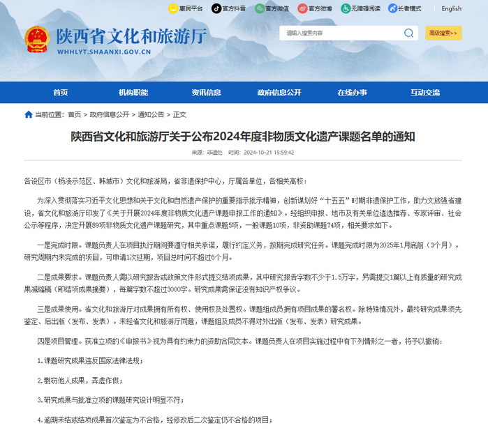 近日,陕西省文化和旅游厅下发了《关于公布2024年陕西省非物质文化遗产课题名单的通知》,我校程天健、李村、王薇、刘哲4位老师成功获批该项目。