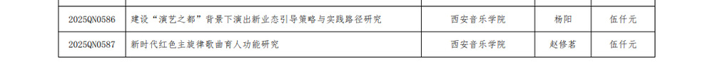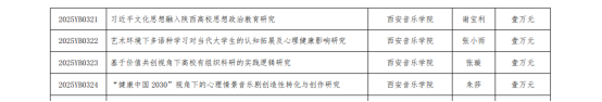此次获批的项目涵盖文化艺术、思想政治教育、高校科研等多领域,包括传统音乐文化在文旅融合中的发展、陕西皮影戏在儿童戏剧里的传承创新、非遗元素与陕西原创音乐融合、习近平文化思想融入高校思政教育、艺术环境下多语种学习对大学生的影响、高校有组织科研实践逻辑、心理情景音乐剧转化创作、演艺产业与红色歌曲育人功能等方面研究。
