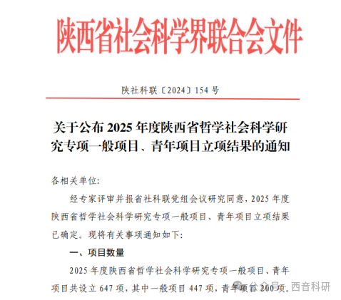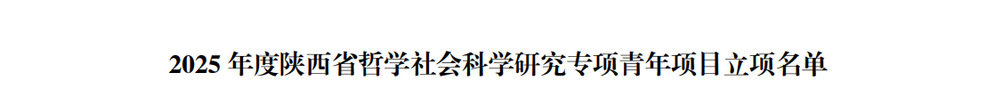 近日,陕西省社科界联合会公布了2025年度陕西省哲学社会科学研究专项一般项目、青年项目的立项名单,我校共有9位教师的项目成功立项,7项一般项目和2项青年项目,展现了我校教师在哲社科研究领域的科研能力和创新活力。