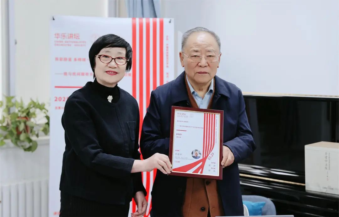 吴玉霞会长为乔建中先生颁发“华乐讲坛”纪念海报