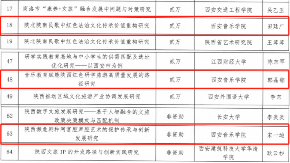 近日,陕西省文化和旅游厅发布《陕西省文化和旅游厅关于公布 2025 年度文化和旅游课题立项名单的通知》,我校田廷广老师《陕北陕南民歌中红色法治文化传承价值重构研究》、郭晶铭老师《音乐教育赋能陕西红色研学旅游高质量发展的路径研究》、宋一迪老师《陕西濒危剧种阿宫腔声腔艺术的保护传承与创新发展研究》三项课题成功获批。在此,向三位老师致以热烈祝贺!