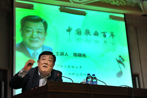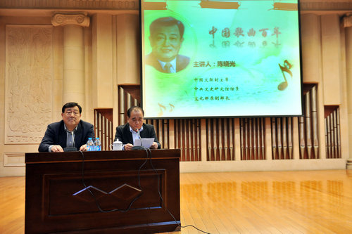 2014年4月10日,著名词作家、诗人,中国文联副主席、全国政协教科文卫体委员会副主任委员、中央文史研究馆馆员、文化部原副部长陈晓光先生应我院65周年校庆系列活动之一暨第51期《乐府讲坛》邀请,在我院作题为《中国歌曲100年》的专题学术讲座。