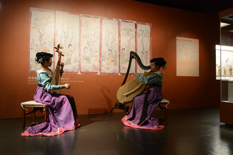 开幕式上,西安音乐学院舞蹈系师生呈现了《苏合香》《团乱旋》《春莺啭》三支唐代宫廷燕乐与教坊大曲软舞类乐舞片段,成为整场活动的一大亮点。这组唐乐舞作品是我院数年来根据刘凤学先生依据古乐舞谱释译研究,倾力打造复现而出的一组具有极高学术价值的唐乐舞作品。其乐舞节奏舒缓,优美柔婉,雍容大气,由内而外传递显现出盛世大唐音乐文化的博大胸怀与恢弘气度。乐舞服饰、妆容则根据唐代壁画、陶俑等物质遗存以及文献记载考证而出,精美绝伦、美轮美奂。在感受唐乐舞的震撼之余,展厅内《阳关三叠》与《婆罗门引》的袅袅琴声荡漾期间,四位老师与西音学子结合展览内容以器乐的形式,鲜活生动的勾勒出大唐盛世音乐文化生活的不同情景,指尖流淌出的是千年非物质音乐文化的历史遗存与人文思想精神的感动。