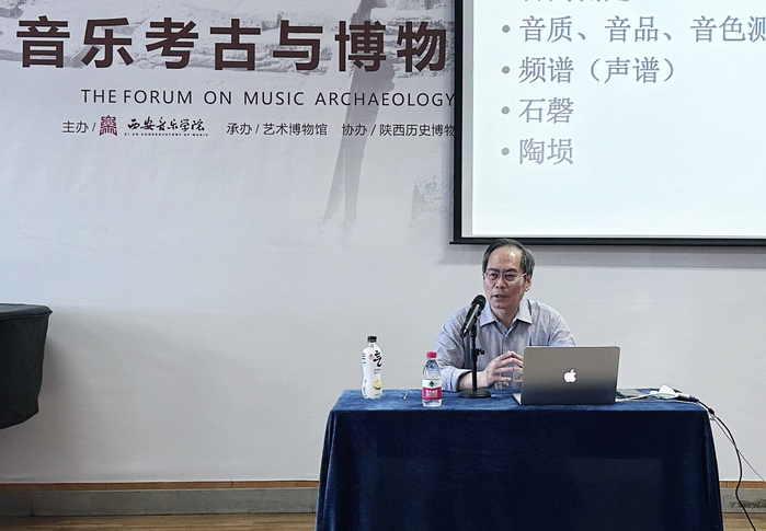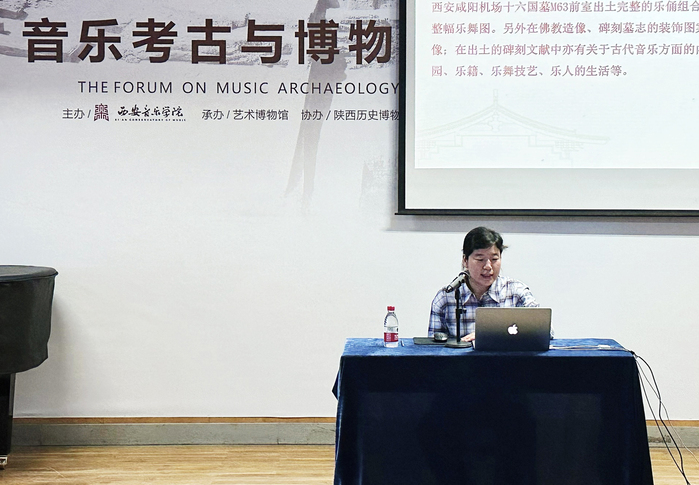 天津音乐学院教授方建军以《音乐考古学的六个课题》为题,围绕出土乐器测音研究、出土乐器复原研究、流散古乐器研究、古乐器辨伪研究、出土音乐文献研究和民族志类比研究等六个课题展开充分例举与深入论证;陕西历史博物馆副馆长庞雅妮研究馆员的讲座主题是《从陕西历史博物馆的精美艺术品看中国古代文明》,她强调中国古代器物上的纹饰均是“有意味的形式”,陕西历史博物馆馆藏不同时期精美的陶器、玉器、青铜器,亦或壁画、瓷器、金银器等纹饰,不仅全面、系统地反映了中华历史文化概貌,还以其无与伦比的丰富性、完整性和典型性,生动体现了不同时代的技术体系与艺术风格。陕西省考古研究院助理研究员赵占锐以《近十年陕西出土北朝至隋唐时期音乐文物及相关问题》为论题,结合自己多年考古发掘和文物研究工作,对北朝至隋唐时期陕西高等级墓葬、遗址中出土的与音乐相关的伎乐俑、乐舞壁画、佛教造像、碑刻墓志等文物进行详细的介绍,为音乐史研究提供了重要依据与叙述视角。