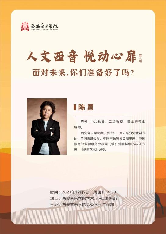 12月9日下午,西安音乐学院声乐系主任陈勇教授应邀出席“悦动心扉”师生交流活动,以《面对未来,你们准备好了吗?》为主题,与学生们亲切座谈交流,党委学生工作部部长张津波主持活动。