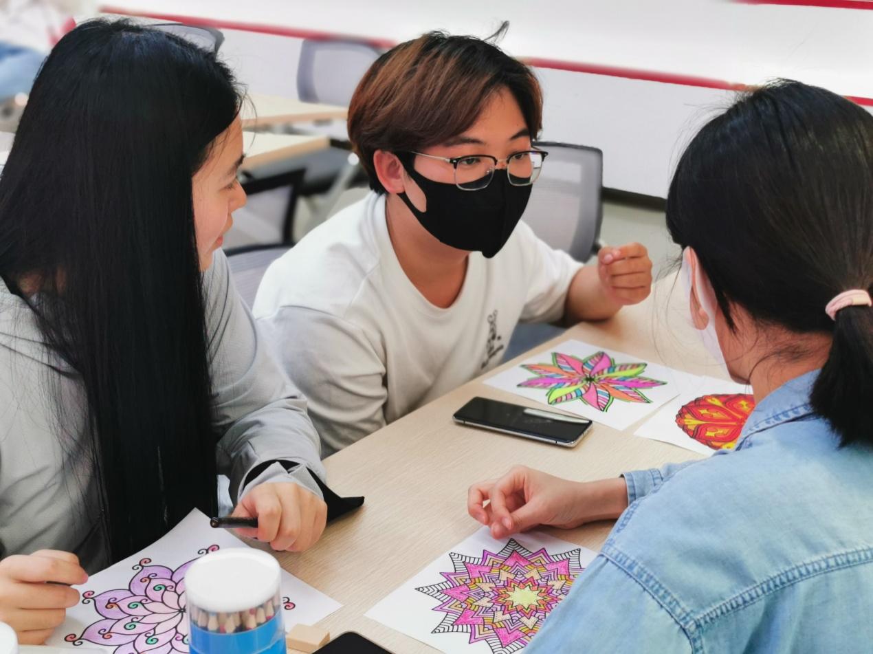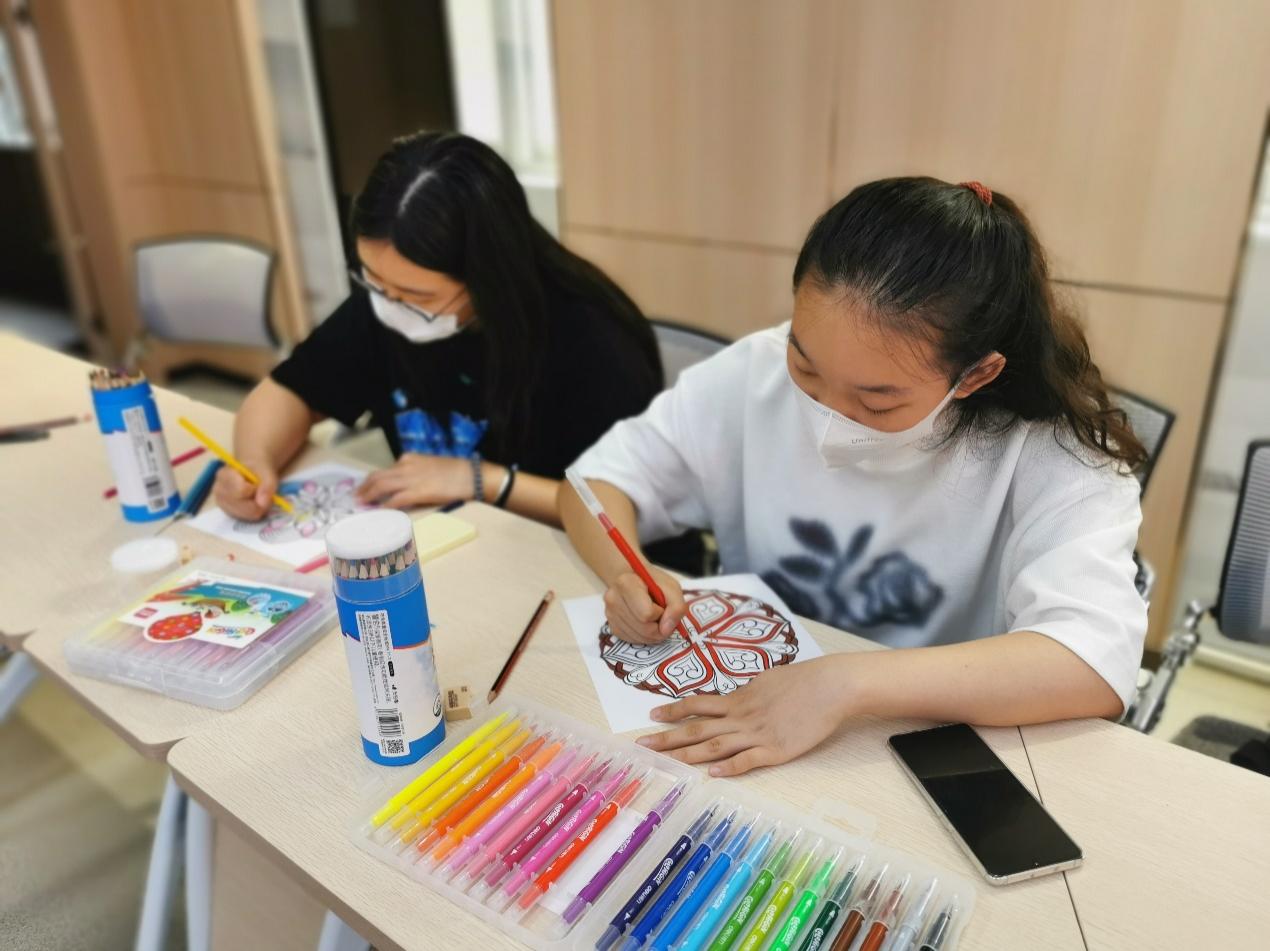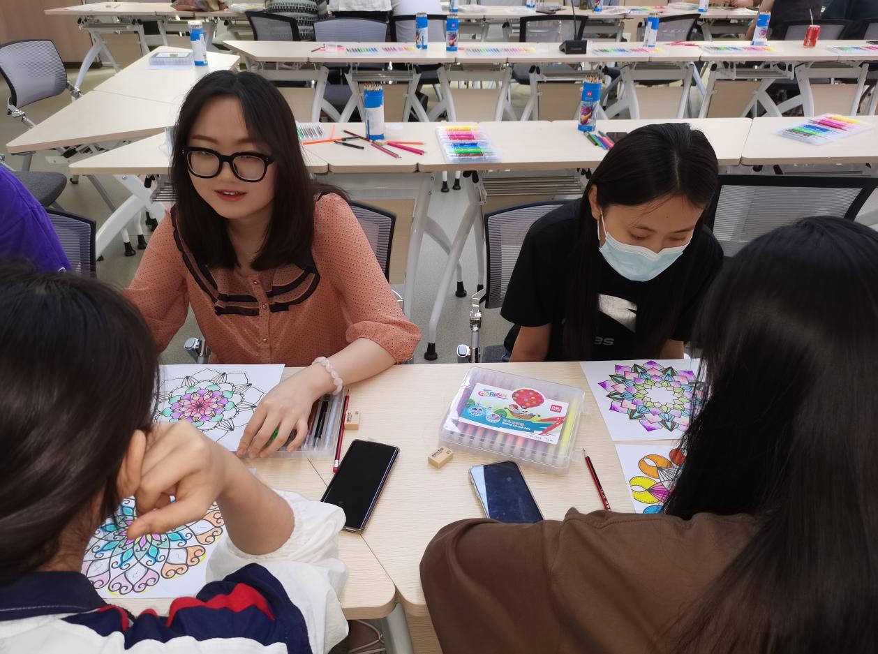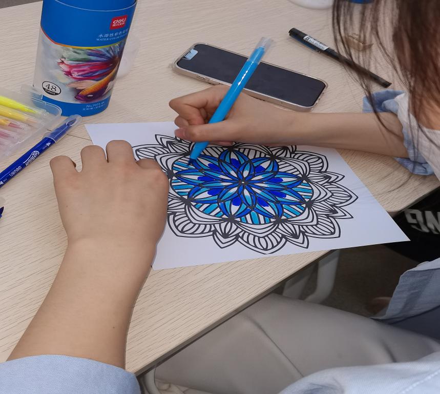 同学们手中的画笔跟随着内心进行流动,在彩绘曼陀罗中释放压力,感知自我。