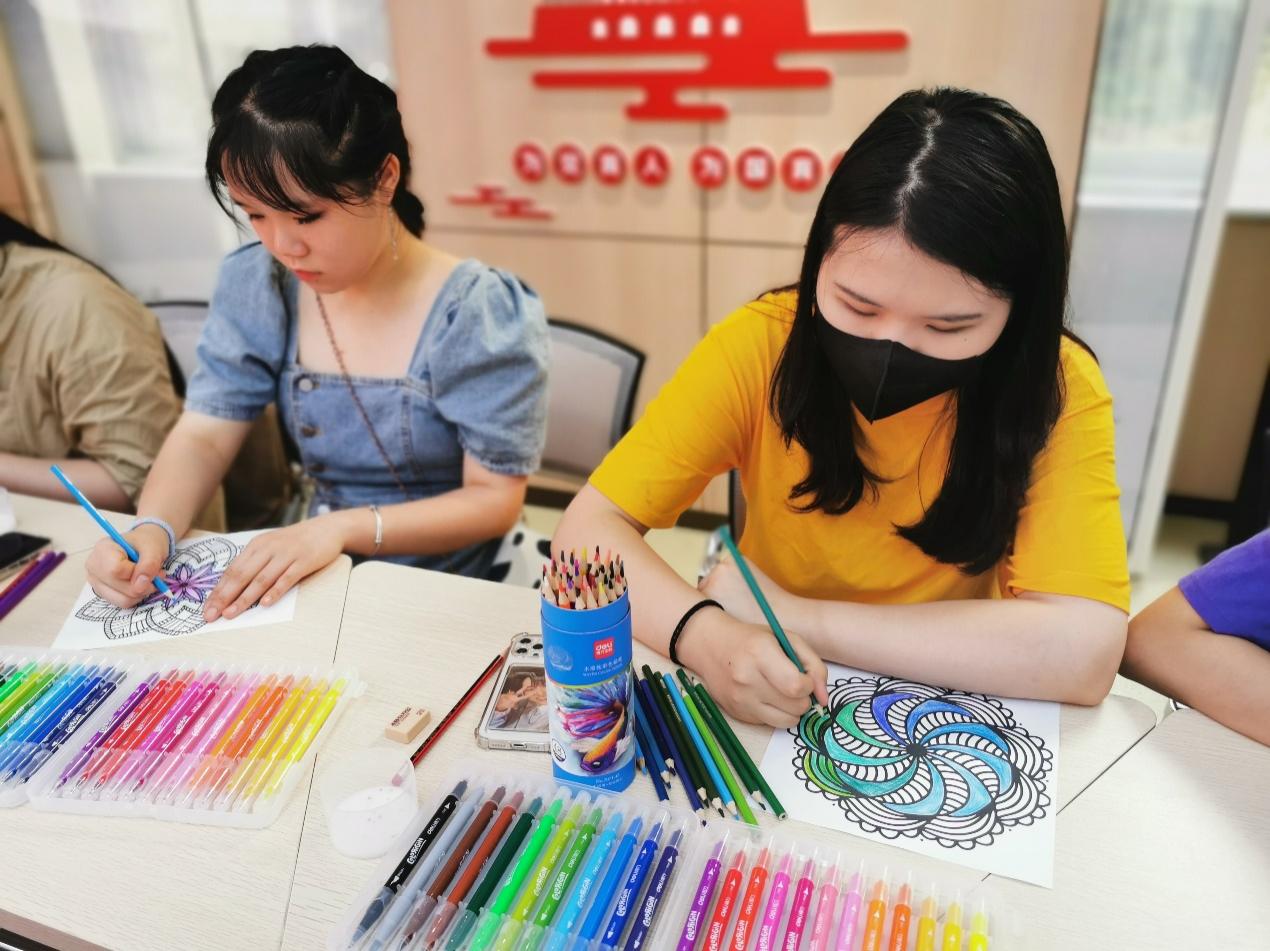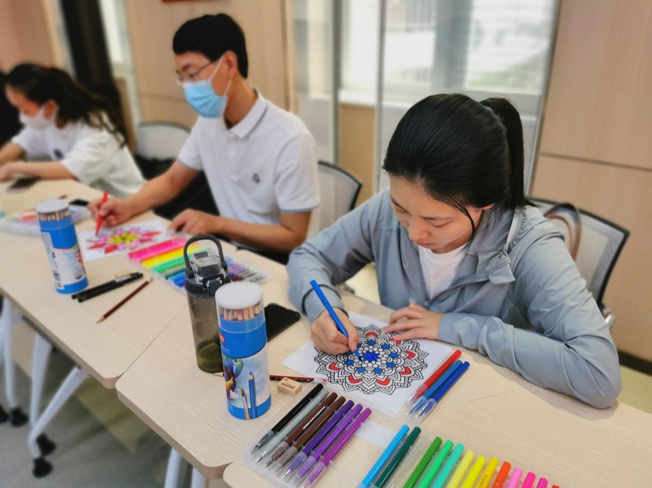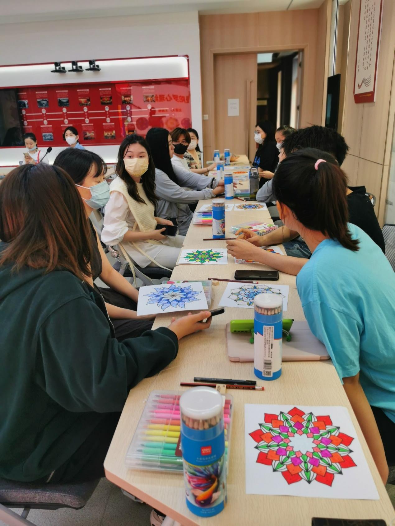 同学们手中的画笔跟随着内心进行流动,在彩绘曼陀罗中释放压力,感知自我。