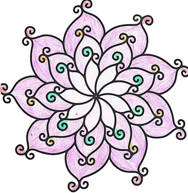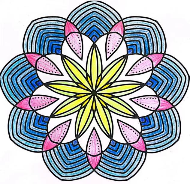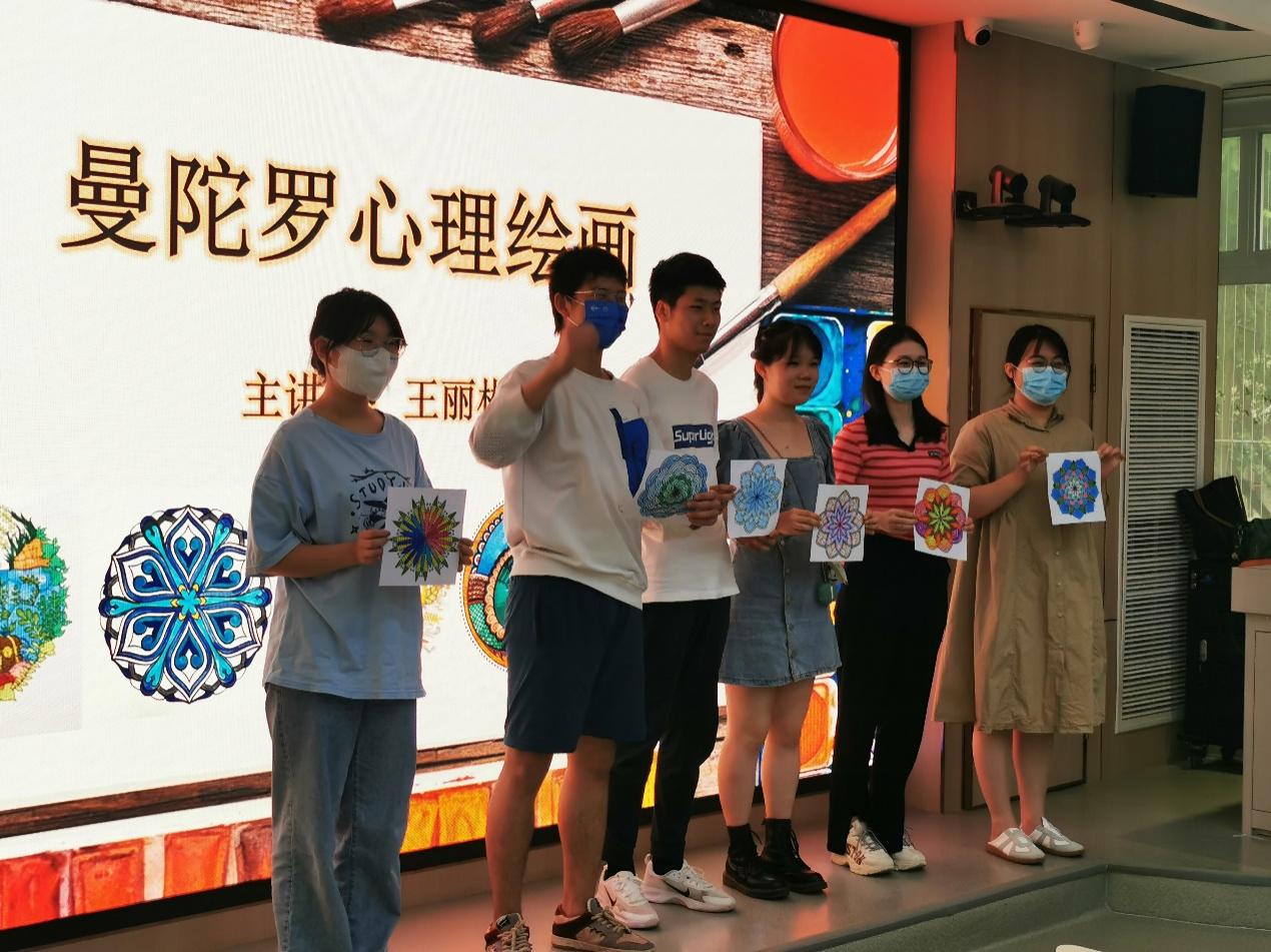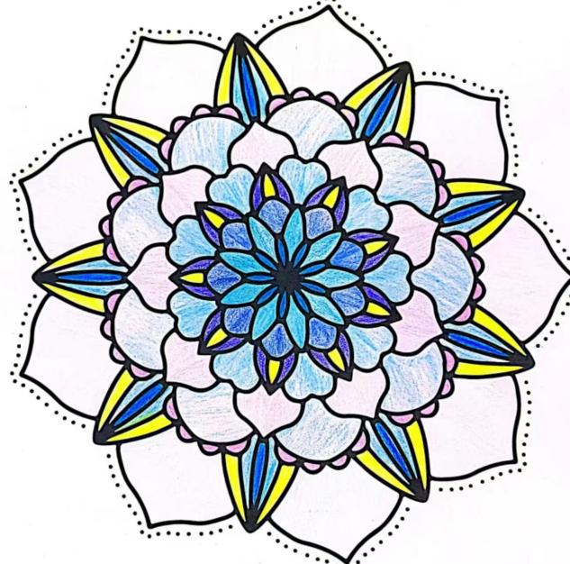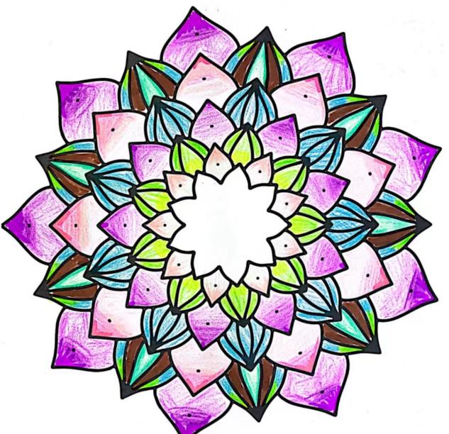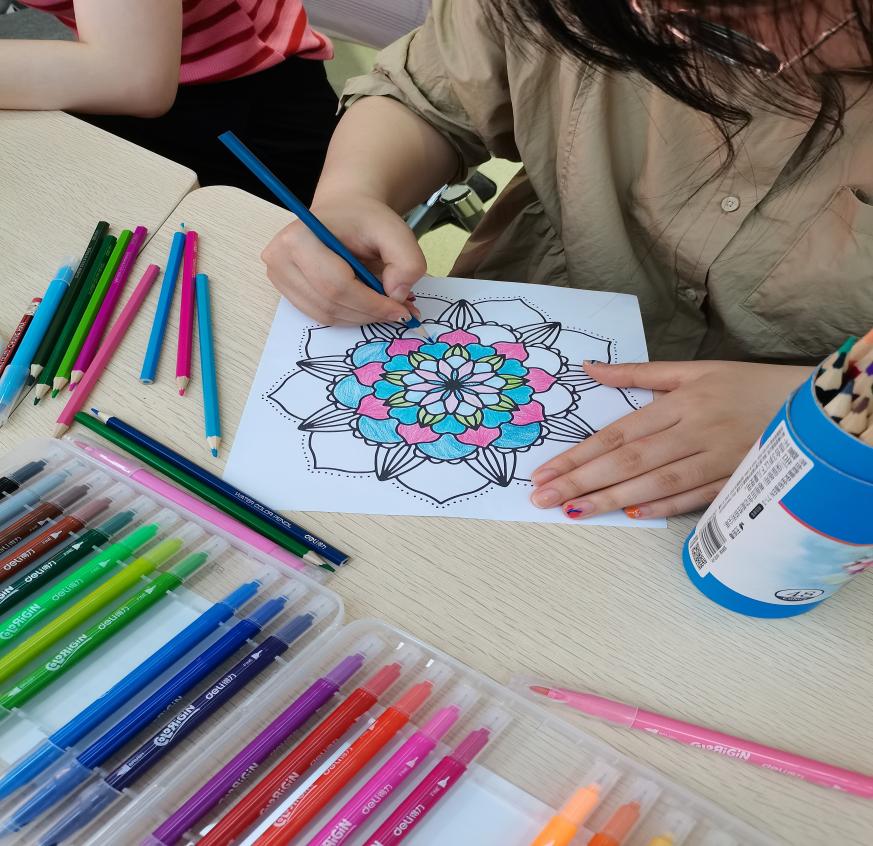 曼陀罗绘画是心理分析荣格学派的理论,具有保护性、凝聚性、整合性、咨询性和超越性的特性,通过曼陀罗绘画能够激发绘画者的内在能量,曼陀罗绘画的过程中就是一种减压和探索自我的过程,能够起到改善情绪、缓解压力、明析自我的作用。曼陀罗绘画能够唤醒内在自性的整合功能,还具有表达和转化情绪的作用,曼陀罗与结构性的涂色有助于减少焦虑,原因是曼陀罗绘画通过凝聚及整合功能,可以增强内心的秩序感,从而减少弥散性焦虑的程度,曼陀罗具有优化情绪的效果。同学们在绘画中感受内心、提高认知、缓解压力。通过彩绘曼陀罗的形式引导学生进行与自己对话,探索自我,接纳自我,从而更加关爱自我。